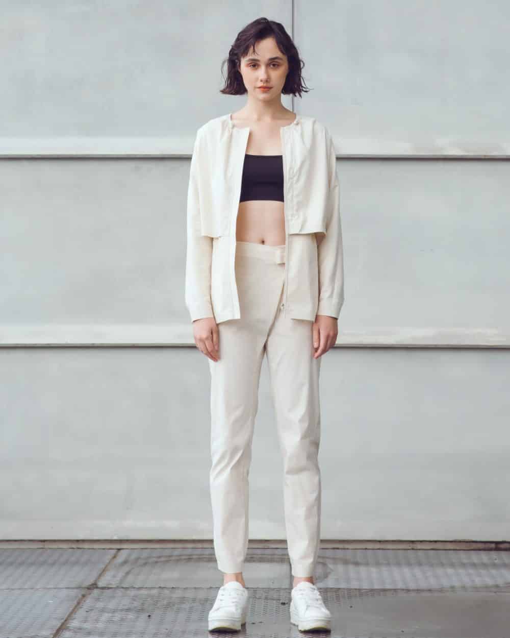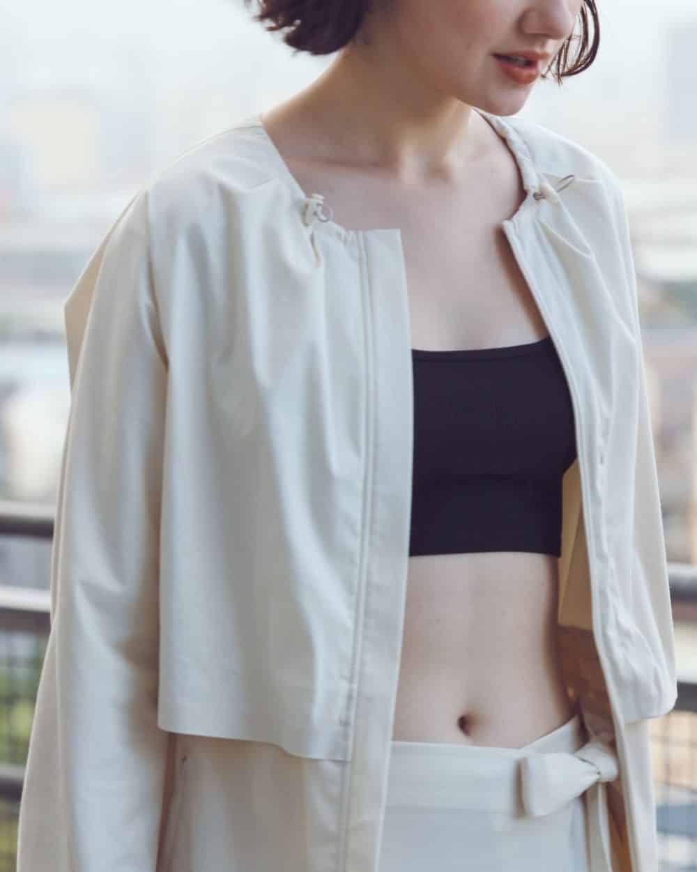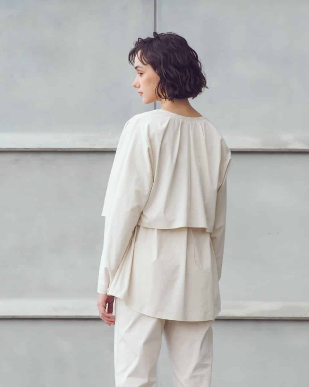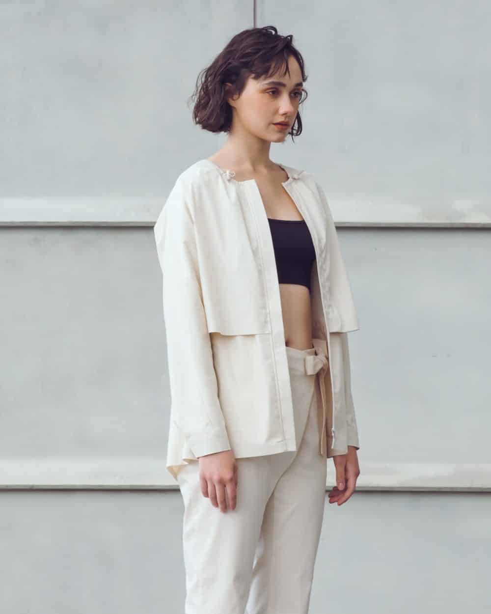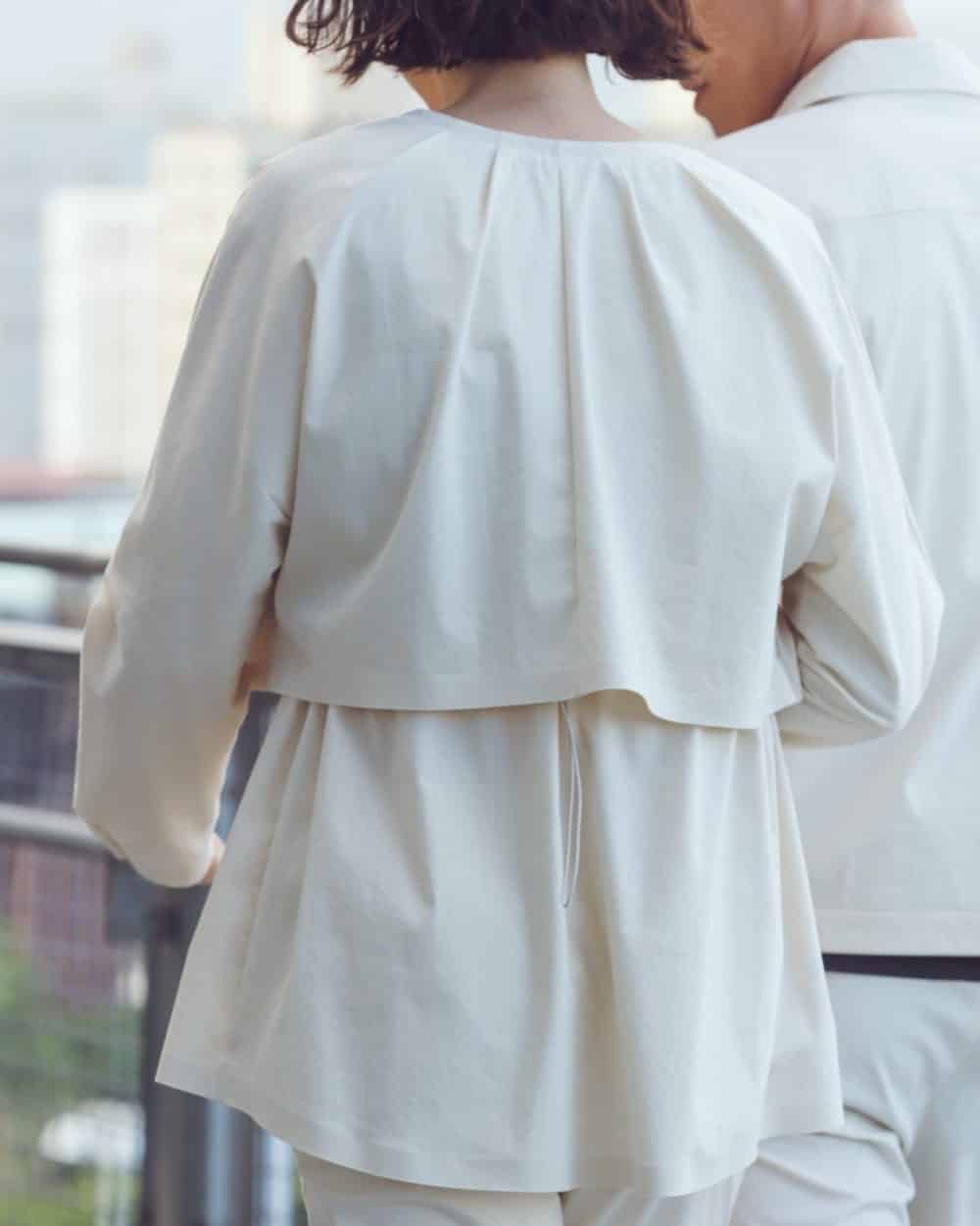 Cape-like silhouette and adjustable details at collar, wrist and waist for customized fit and gives feminine looks. Voluminous zipped pockets for extra storage.